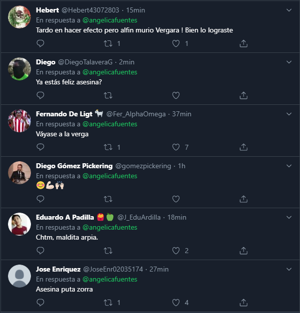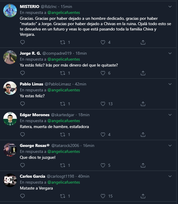 Angélica Fuentes, quien fuera esposa del recién fallecido Jorge Vergara, ha recibido insultos a través de aficionados en su cuenta de Twitter a raíz de la muerte del ex propietario del Rebaño.