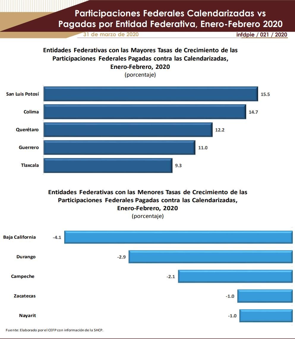 Sin embargo, otra de las entidades a las que le depositaron más recursos de los calendarizados, son: Colima a quien le pagaron mil 233.3 millones de pesos en lugar de mil 075.5 millones calendarizados,14.7% más.