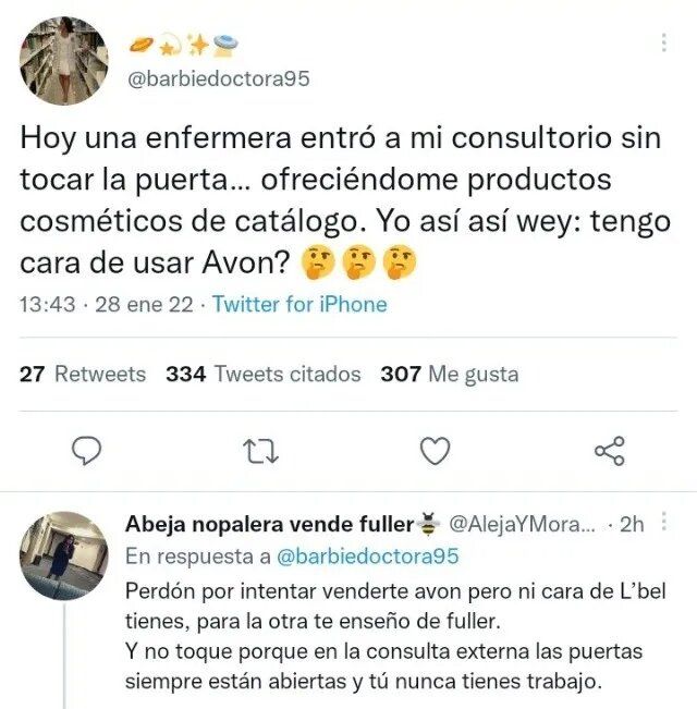 "Hoy una enfermera entró a mi consultorio sin tocar la puerta... ofreciéndome productos cosméticos de catálogo. Yo así de wey: ¿tengo cara de usar Avon?", se puede leer en el famoso tweet.