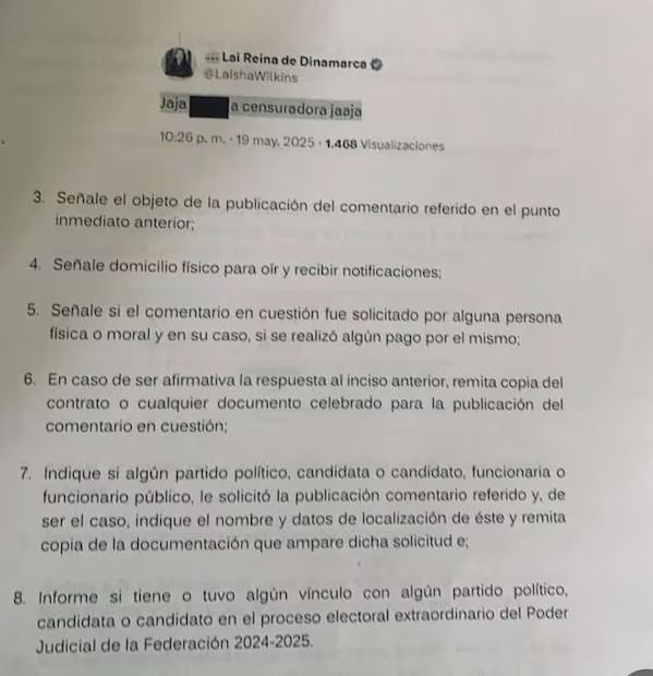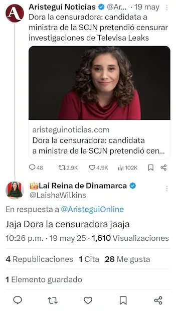 En X, Laisha publicó una fotografía de la denuncia en la que se muestra la captura del tuit que posteó del cual se le pide dar explicaciones tras la publicación de Aristegui Noticias en la que mostraba una nota titulada "Dora la Censuradora: candidata a ministra de la SCJN pretendió censurar investigaciones de Televisa Leaks".