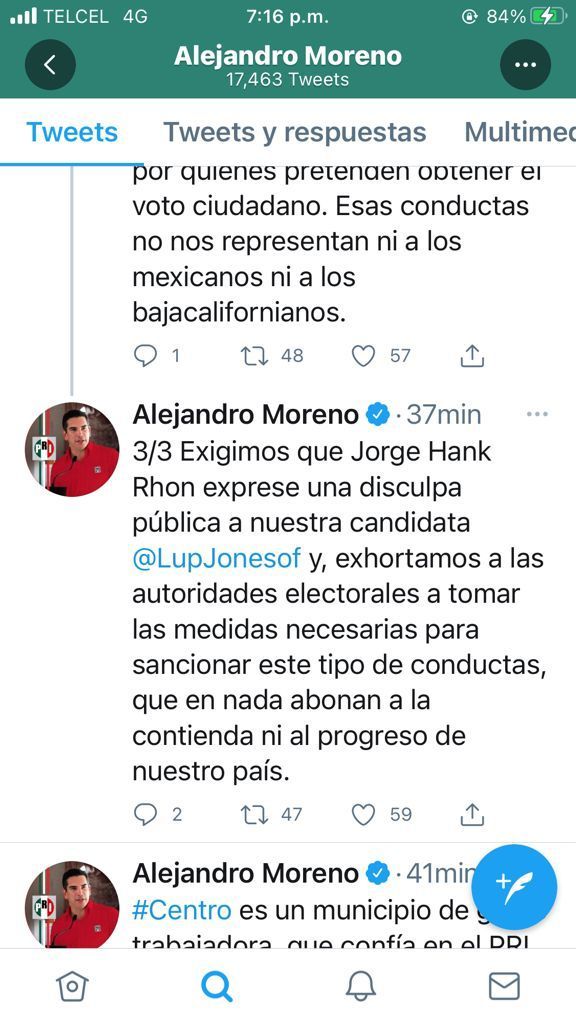 "Exigimos que Jorge Hank Rhon exprese una disculpa pública a nuestra candidata @LupJonesof y, exhortamos a las autoridades electorales a tomar las medidas necesarias para sancionar este tipo de conductas, que en nada abonan a la contienda ni al progreso de nuestro país."