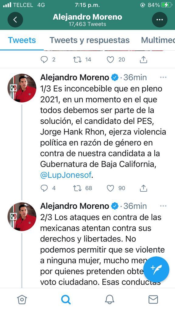 "Es inconcebible que en pleno 2021, en un momento en el que todos debemos ser parte de la solución, el candidato del PES, Jorge Hank Rhon, ejerza violencia política en razón de género en contra de nuestra candidata a la Gubernatura de Baja California, @LupJonesof."