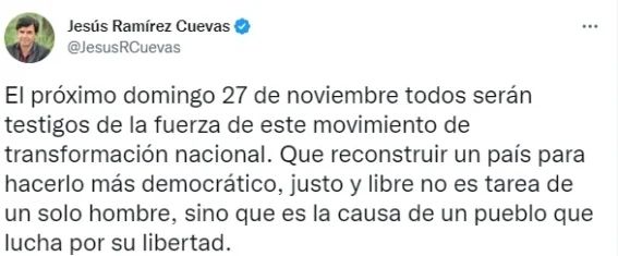 “El próximo domingo 27 de noviembre todos serán testigos de la fuerza de este movimiento de transformación nacional. Que reconstruir un país para hacerlo más democrático, justo y libre no es tarea de un solo hombre, sino que es la causa de un pueblo que lucha por su libertad”, escribió Ramírez Cuevas.