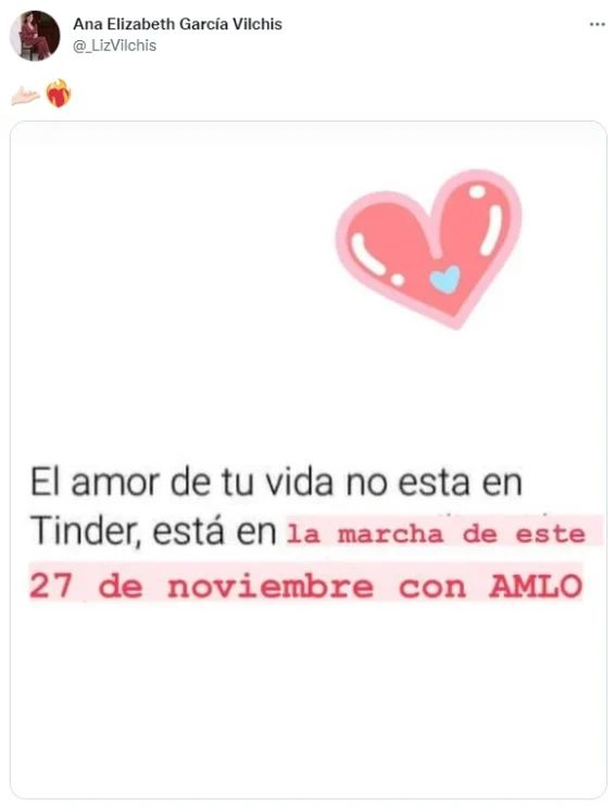 “El amor de tu vida no está en Tinder, está en la marcha de este 27 de noviembre con AMLO”, dice el mensaje que publicó García Vilchis.