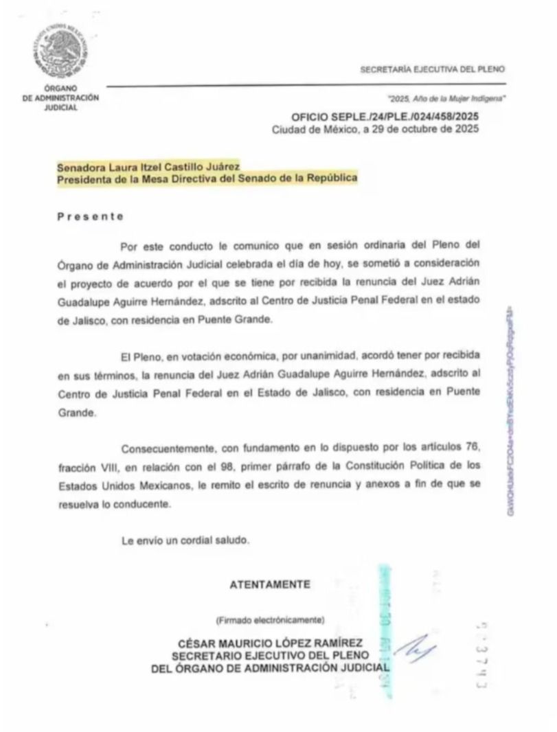 Adrián Guadalupe Aguirre se desempeñaba desde el 1 de septiembre como juez de distrito en el Centro de Justicia Penal de Puente Grande, la zona en la que se ubica la cárcel de alta seguridad de la que escapó el famoso narcotraficante y antiguo líder del Cartel de Sinaloa Joaquín El Chapo Guzmán, clausurada parcialmente en 2020. El juez electo había sido propuesto por el Poder Ejecutivo federal y ganó los comicios con 36.084 votos, 6.000 votos más que la segunda en la carrera, Amalia Irandery Ortiz, quien pasaría a ocupar ahora el cargo, según está previsto en la reforma judicial. Ella fue propuesta por el Poder Legislativo.
