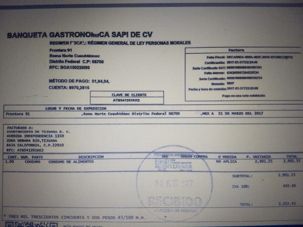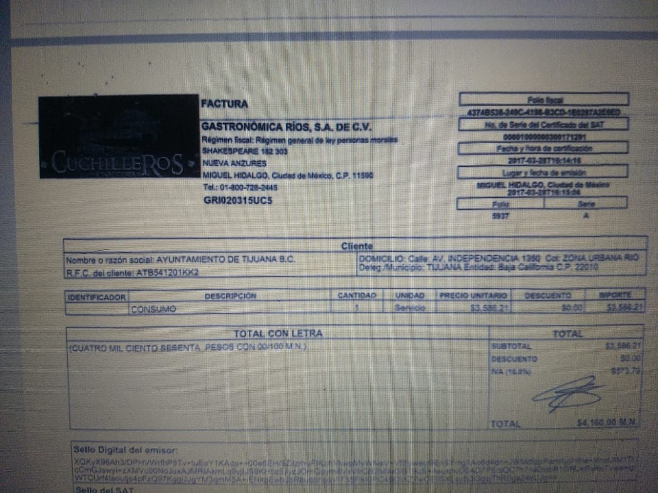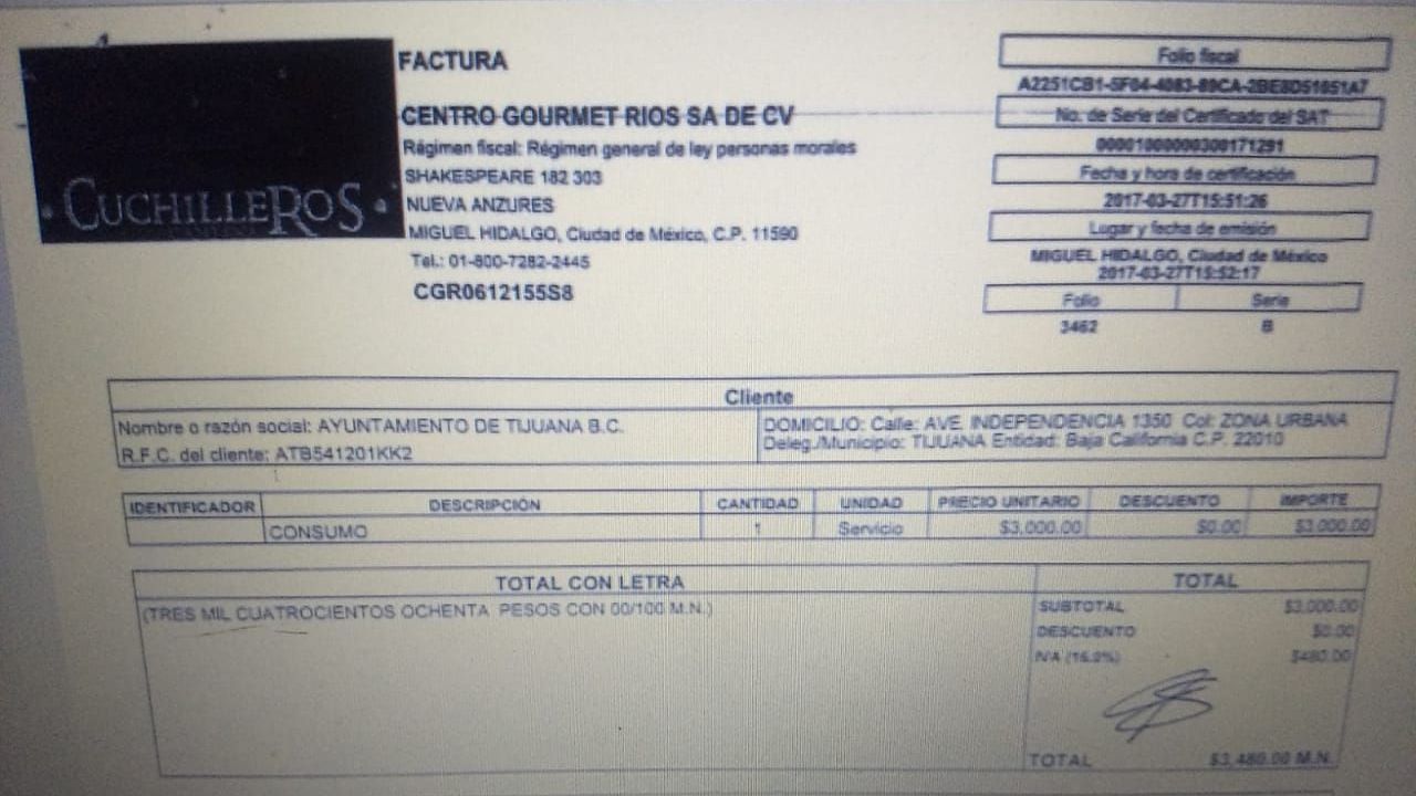 Los días 26 y 27 de marzo, en Cuchilleros Cantina se pagaron cuentas por consumo de tres mil 260 y tres mil 480 pesos, respectivamente, por último, en el lugar Banqueta Gastronómica se pagaron tres mil 352 pesos, todos los gastos fueron facturados al Ayuntamiento de Tijuana.