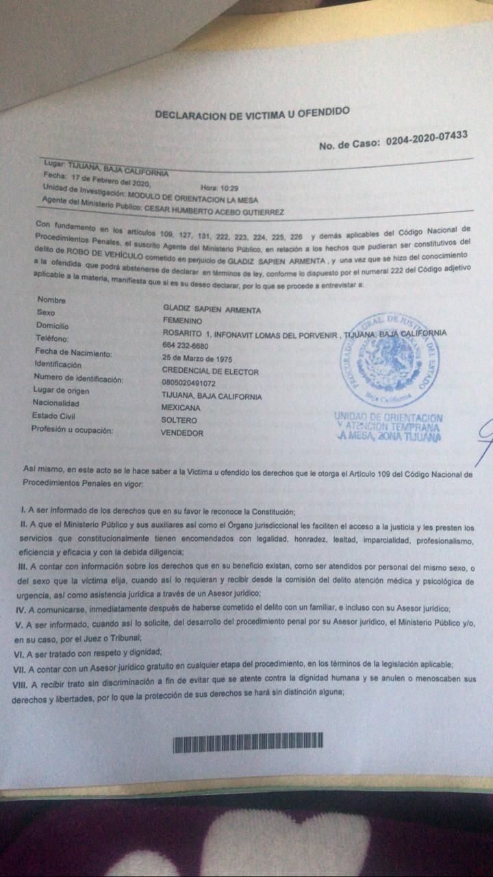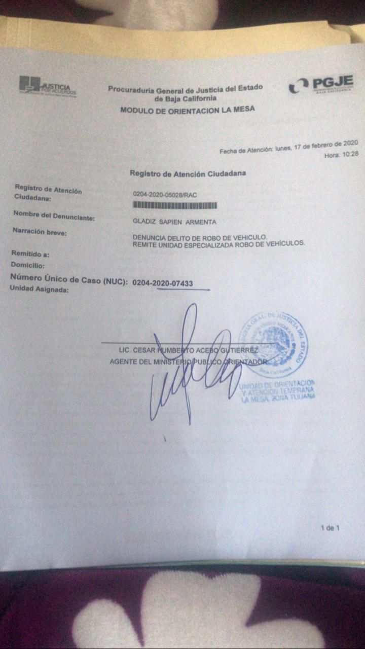 Piden ayuda para localizar un auto que fue robado, el vehículo es un Hyundai Elantra 2015, a nombre de Gladys Sapien Armenta, el auto esta recién importado y aun no cuenta con placas.