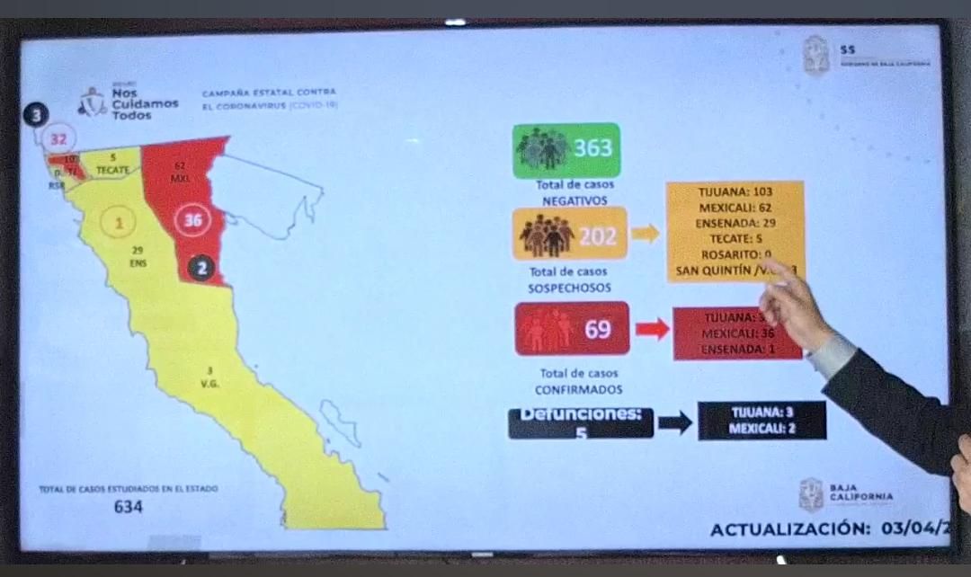 Dijo que los casos confirmados de COVID-19 están ubicados en Tijuana (32), Mexicali (36) y por primera vez un caso registrado en Ensenada (1).