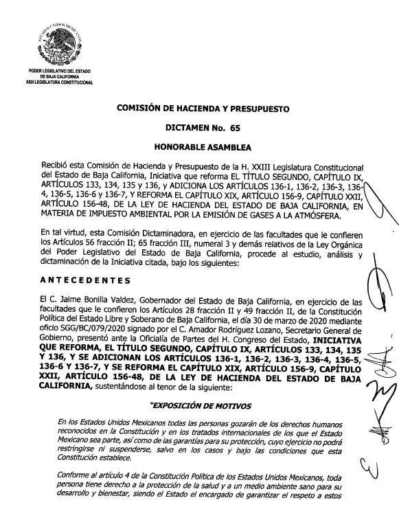 También, en el dictamen número 65, se prevé la aprobación del impuesto ambiental por la emisión de gases a la atmósfera.