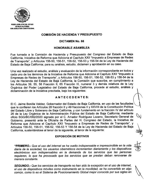 En el dictamen número 66 se establece que el "impuesto a empresas de redes de transporte" será 1.50% por cada envío o traslado realizado.