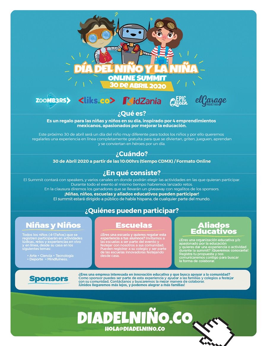 Esta iniciativa, convocada por Kidzania, Epic Queen, Liks, Zoombers y El Garage Project Hub, busca brindar una experiencia innovadora y enriquecedora para todas las familias mexicanas. Este próximo 30 de abril será un día del niño muy diferente para todos los niños y por ello queremos regalarles una experiencia en línea completamente gratuita para que se diviertan, griten, jueguen, aprendan y se conviertan en héroes por un día.