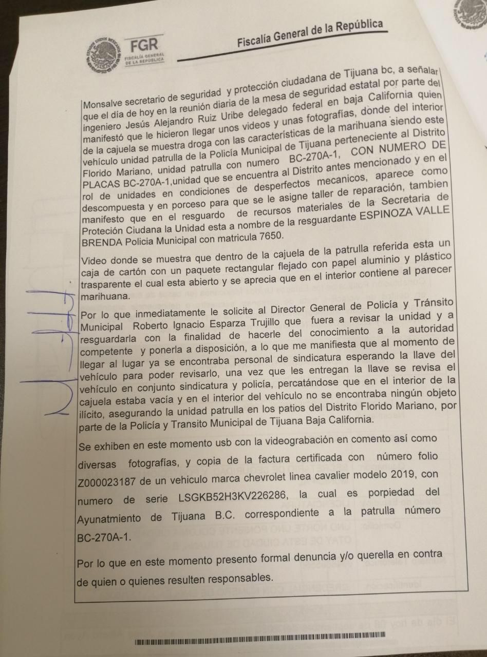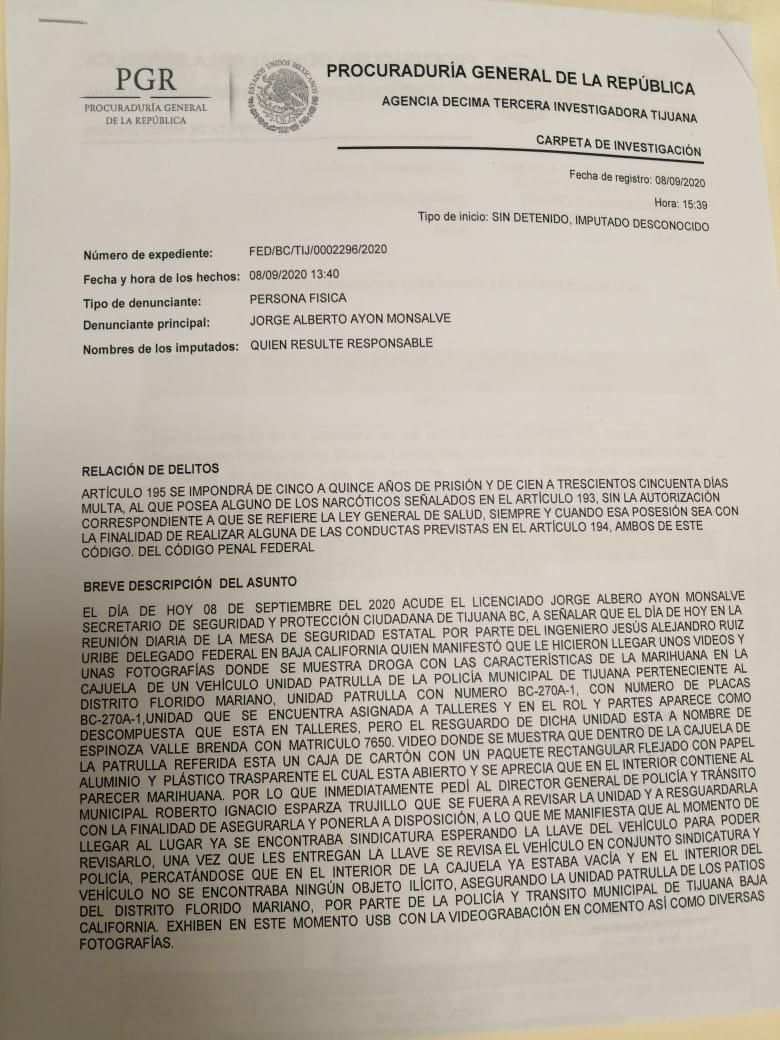 Luego que ayer, el delegado federal, Jesús Ruiz Uribe, exigiera la remoción del cargo del titular de la Secretaría de Seguridad en tanto se investiga un video en el que se observa un paquete de droga al interior de una unidad de policía de TIjuana, Jorge Ayón Monsalve presentó una denuncia ante pa FGR por la desaparición de la droga mencionada.