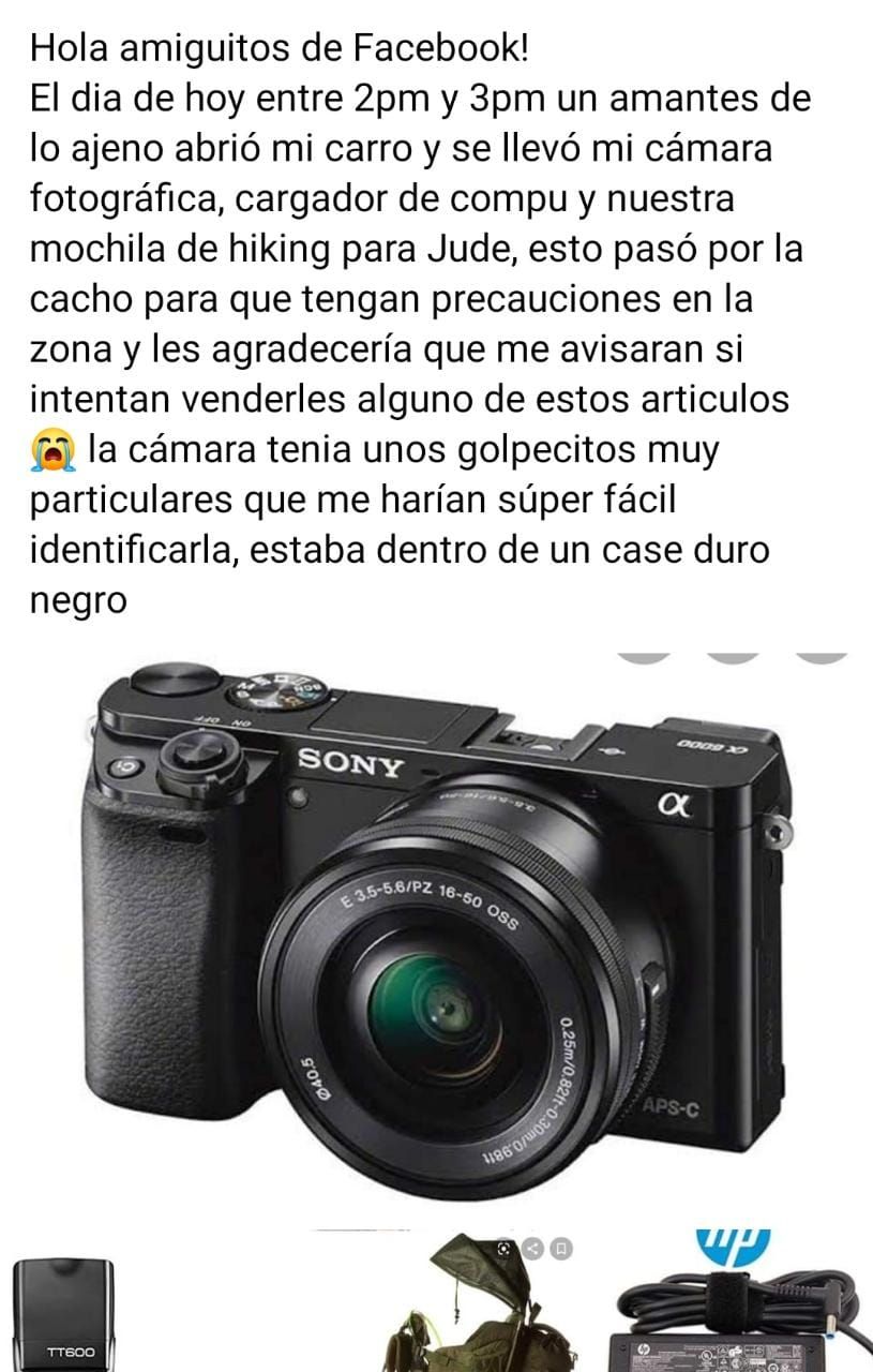 Una ciudadana usuaria de la red social Facebook denuncio mediante una publicación el robo de su herramienta de trabajo; una cámara, cargador, cargador de computadora portátil, y una mochila especializada para escalar de su pequeño.