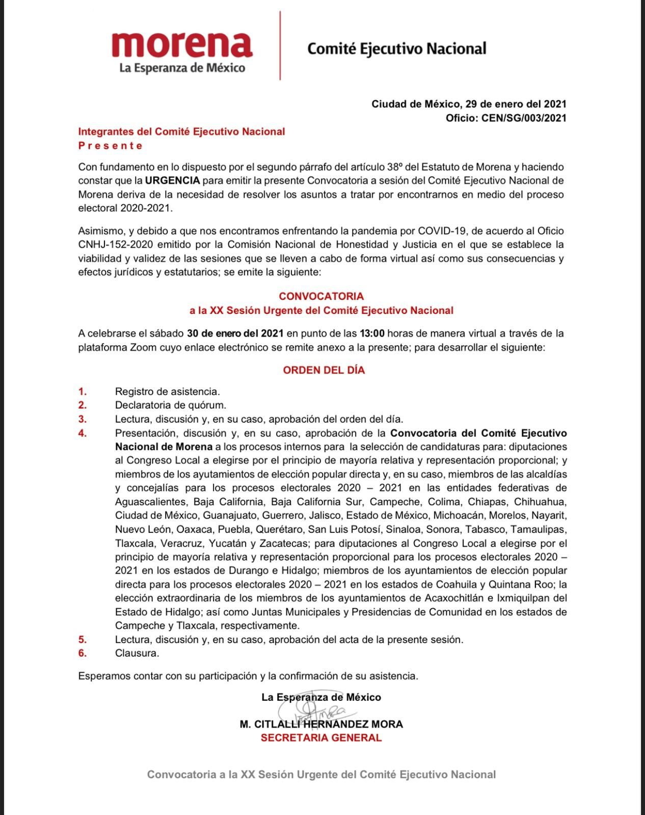 Con un sentido de urgencia, el Comité Ejecutivo Nacional de Morena sesionará a fin de liberar las convocatorias para el registro de precandidatos a alcaldes en las distintas entidades.