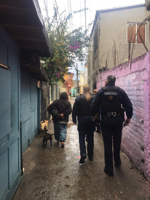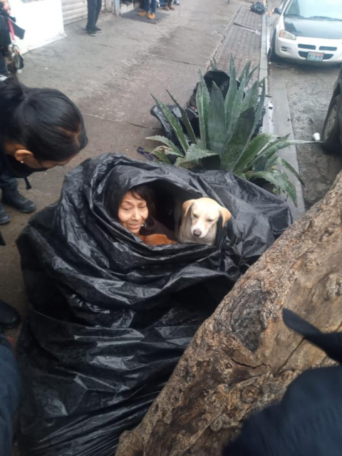 Bajo condiciones climáticas extremas, de bajas temperaturas y lluvia, fue rescatada una mujer de la vía pública, por la policía municipal de Tijuana. Se protegía apenas con una bolsa de plástico, en la que en su generosidad, alcanzaba a arropar a su mascota, un perro que siempre le acompaña.
