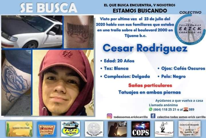 El joven Cesar Rubén Rodríguez de 20 años de edad fue visto por última vez en la Colonia Altiplano en la ciudad de Tijuana.