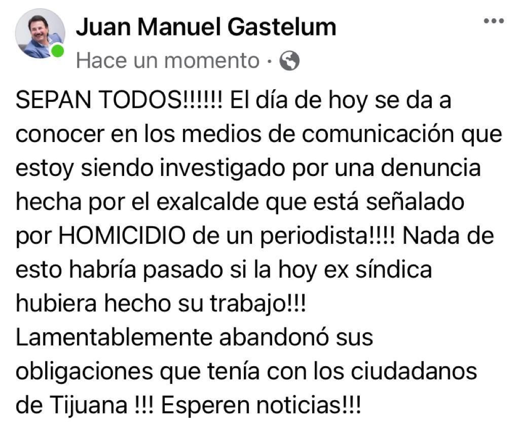 El ex alcalde de Tijuana, Juan Manuel Gastelum, publicó en la red social Facebook que está siendo investigado a consecuencia de una denuncia realizada “por el exalcalde que está señalado por homicidio de un periodista”.
