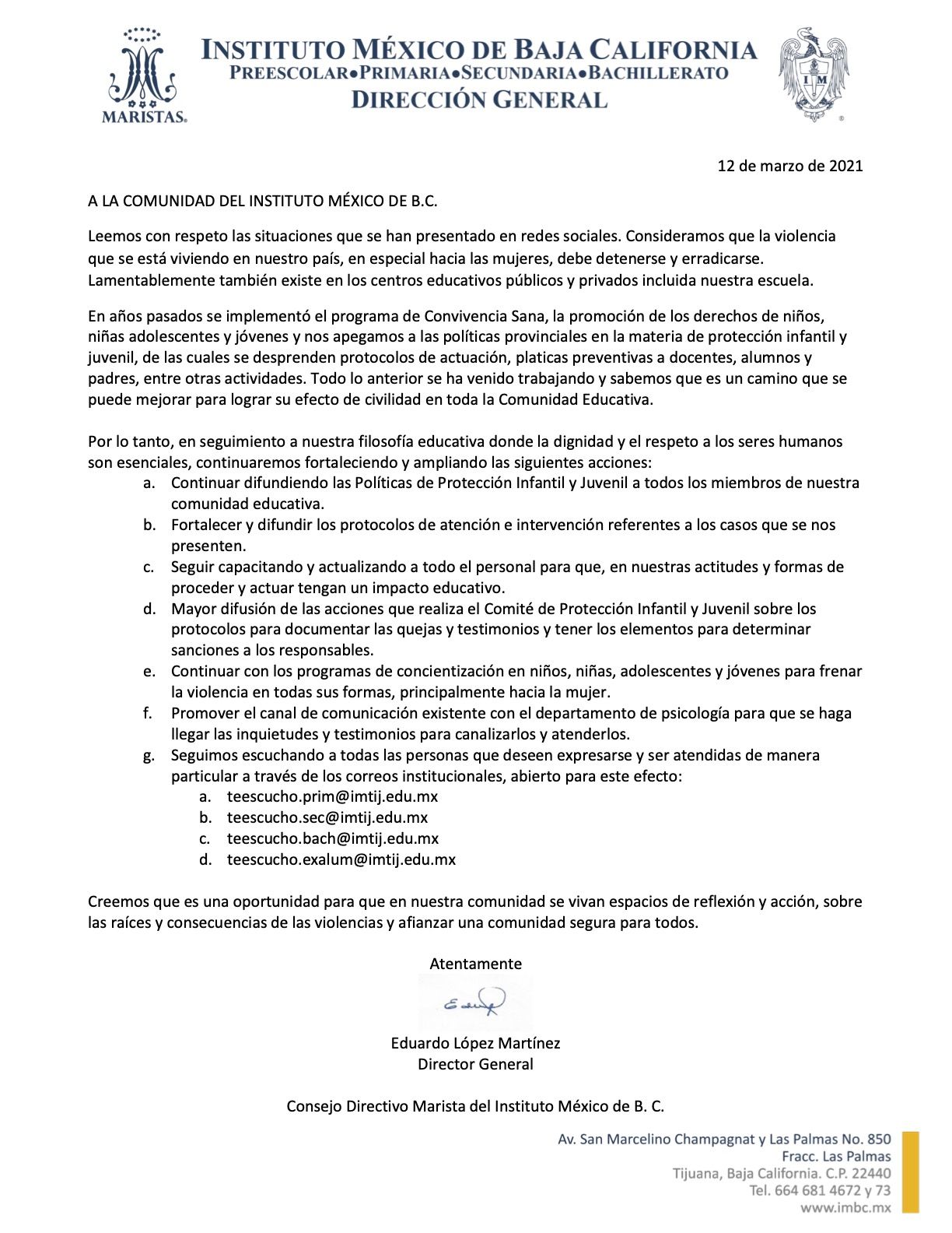 "Consideramos que la violencia que se está viviendo en nuestro país, en especial hacia las mujeres, debe detenerse y erradicarse. Lamentablemente también existe en los centros educativos públicos y privados incluida nuestra escuela" aclaró el Director del plantel, Eduardo López Martínez en dicho comunicado.