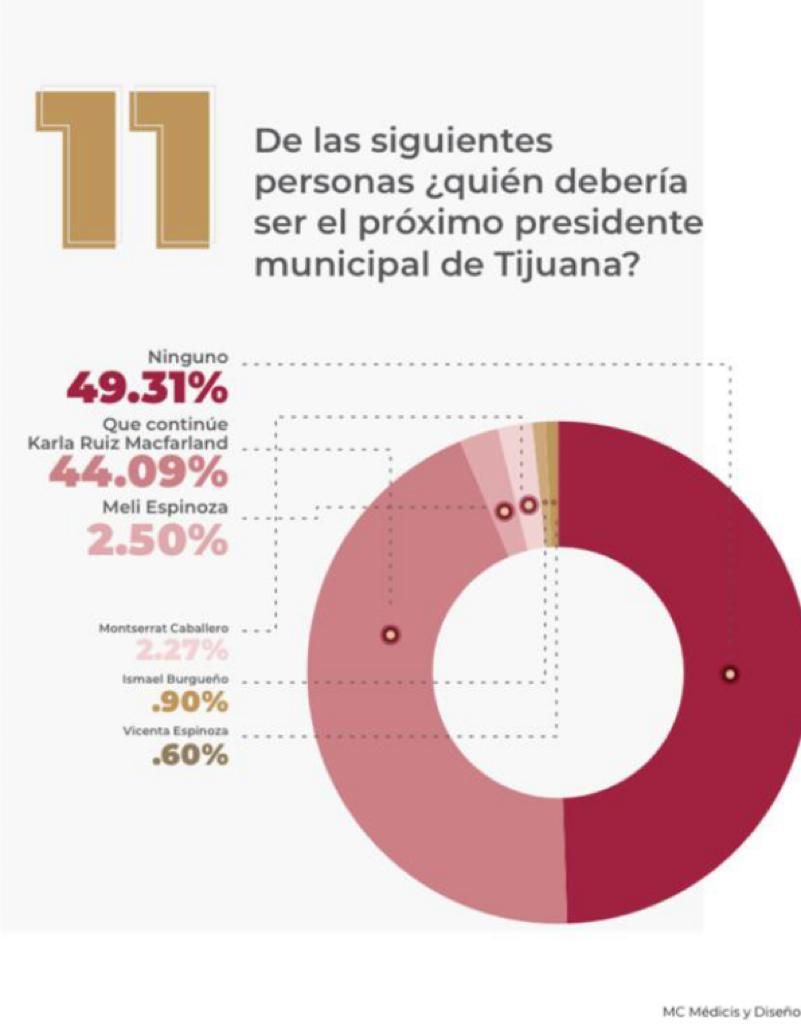 De acuerdo con la encuesta Ruiz MacFarland Adelanta en las preferencias pon una diferencia de más del 41% a su más cercana competidora, en este caso la Síndica Procuradora con licencia, Meli Espinosa quien aparece con apenas 2.5 por ciento.