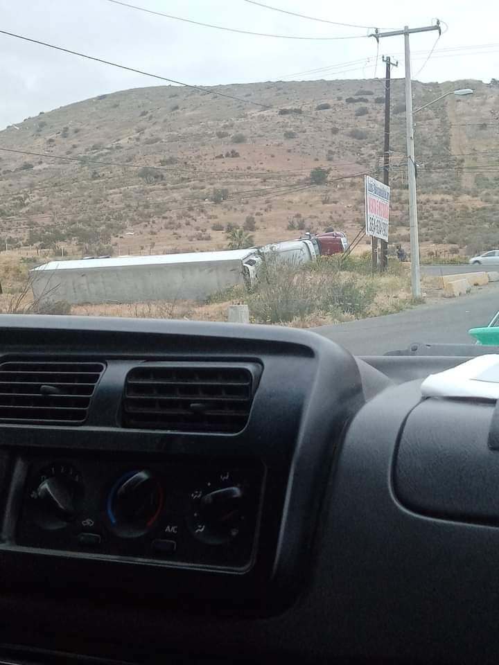 Volcadura de un tracto camión sobre la carretera libre Tijuana- Tecate a la altura del semáforo de Villas del Campo