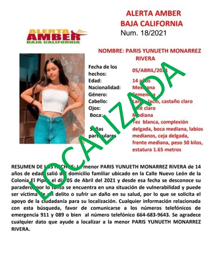 La Fiscalía General de Baja California informa que ha localizado con bien, a la menor de 14 años de edad, Paris Yunueth Monarrez Rivera, por quien se emitió una Alerta Amber este lunes 5 de abril.