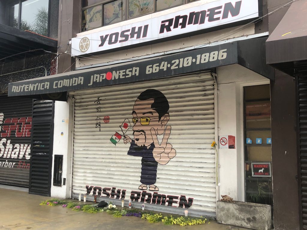 En la entrada a su restaurante ubicado en la avenida Revolución, ciudadanos han colocado flores en memoria de Yoshi Ramen, asesinado la mañana de ayer en Playas de Tijuana.