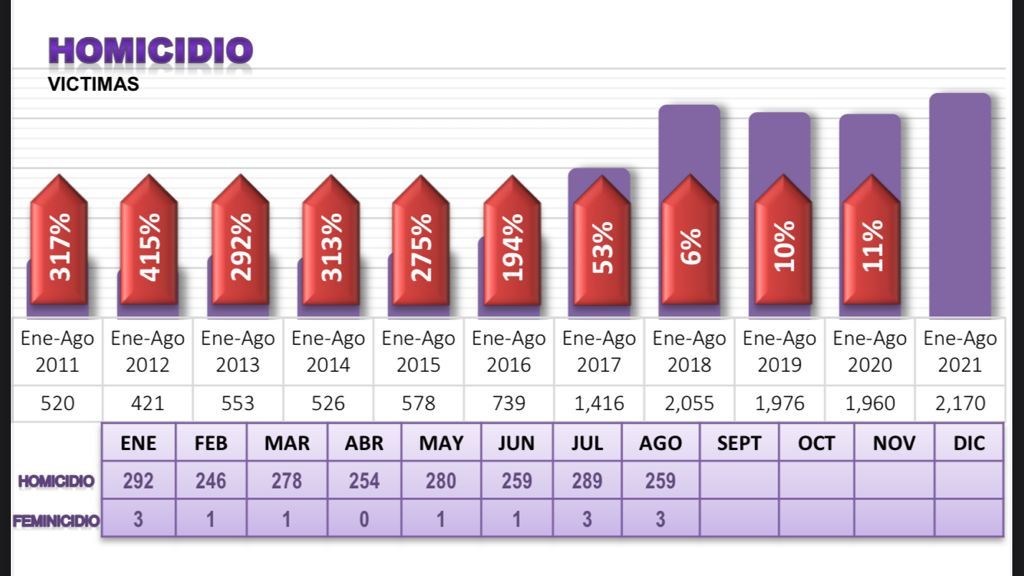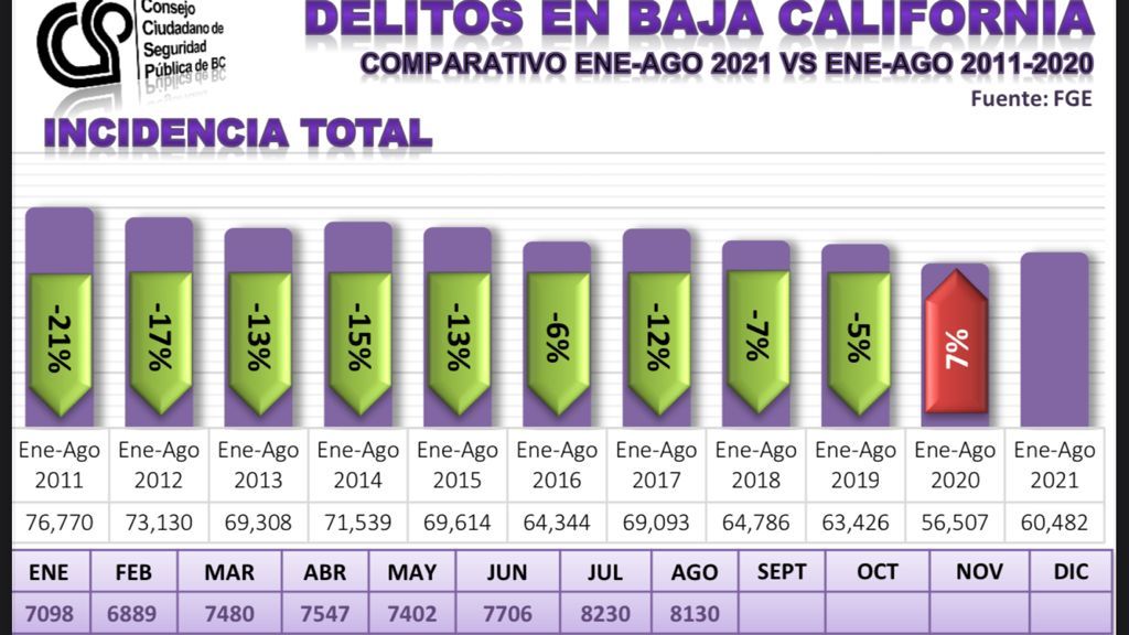 La incidencia delictiva en Baja California perdura a nivel general. En relación al tablero de incidencia delictiva que publica la Fiscalía General del Estado, durante el periodo de enero a agosto de 2021, y en comparación con el mismo periodo del año inmediato anterior, hubo un incremento en la incidencia delictiva total del siete por ciento.