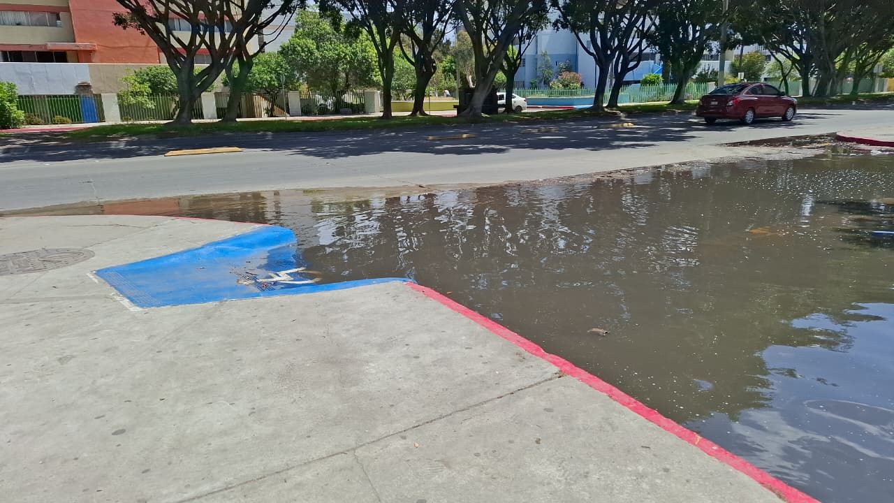 Una fuga de aguas negras en la calle Xavier Villaurrutia, en la zona de Paseo Centenario, ha provocado encharcamientos, malos olores y dificultades para el paso de peatones y personas con discapacidad.