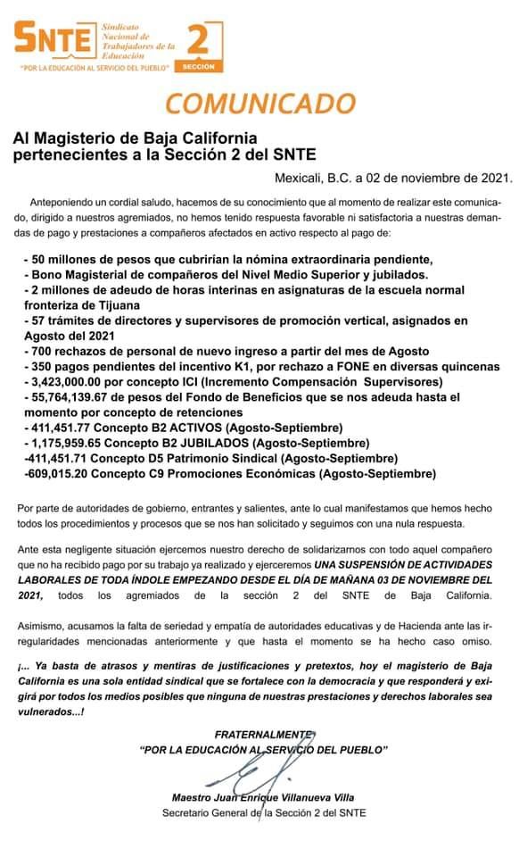 Los miembros de la Sección 2 del Sindicato Nacional de Trabajadores de la Educación (SNTE) en Baja California anuncian paro de labores este próximo miércoles tras la nula respuesta que han recibido por parte de las autoridades del estado sobre la falta de pagos que sufren los agremiados.
