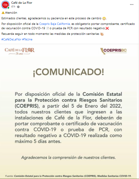 Café de Flor, quien tiene una gran cantidad de sucursales a lo largo de la ciudad, también informó que se apegarán a las reglas emitidas por el departamento de salud y se deberá mostrar el comprobante o una prueba PCR.