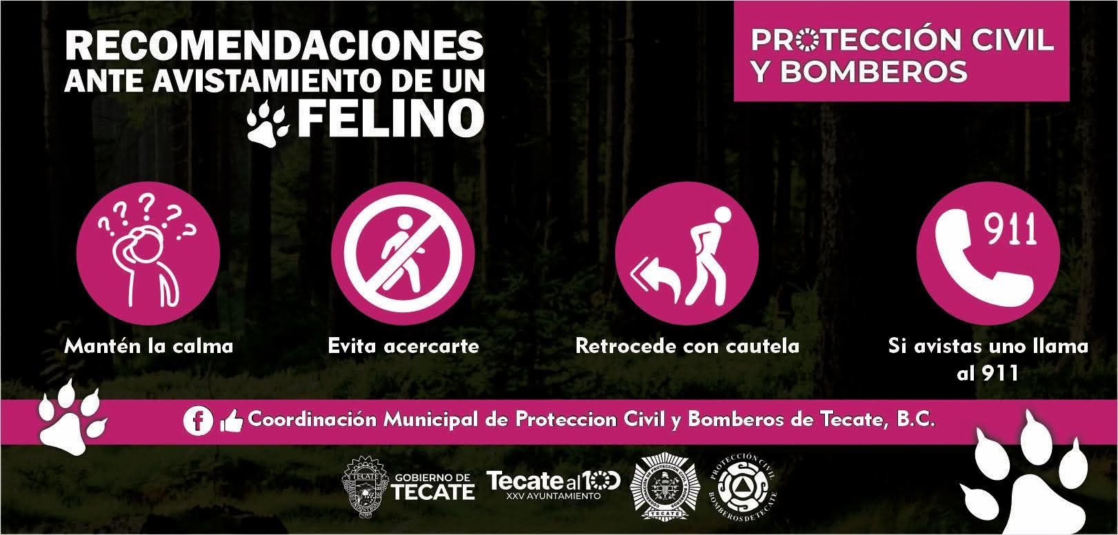 Tecate.- La Coordinación de Protección Civil y Bomberos de Tecate, Baja California, informó sobre un avistamiento de un felino en la zona de Nido de las Águilas, lo que provocó preocupacion entre los trresidentes de la comunidad.