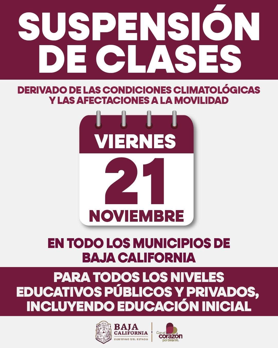 La Gobernadora de Baja California, Marina del Pilar Avila Olmeda, anunció la suspensión de clases este viernes 21 de noviembre en todos los niveles educativos, tanto públicos como privados, en respuesta a las lluvias que se esperan por la llegada del Frente Frío No. 16.