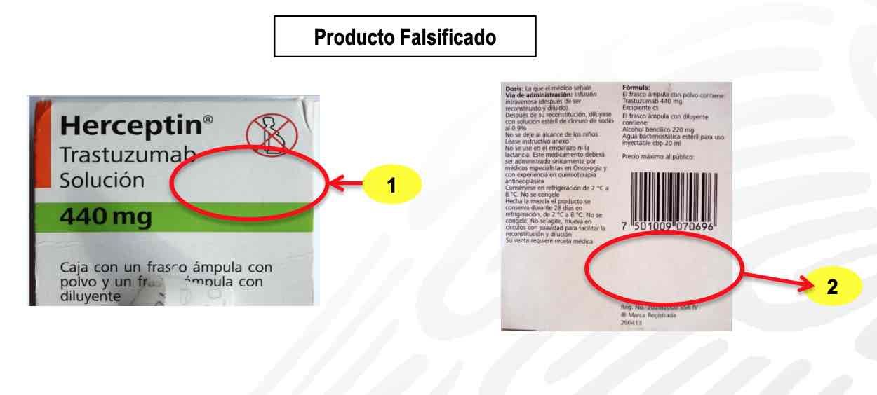 Se trata de Herceptin o Trastuzumab de 440 miligramos, de acuerdo con el portal de la comisión, se inició una investigación a partir de la denuncia presentada por Laboratorios Roche S.A. de C.V., ante la falsificación del producto Herceptin (Trastuzumab) 440 mg Frasco ámpula.