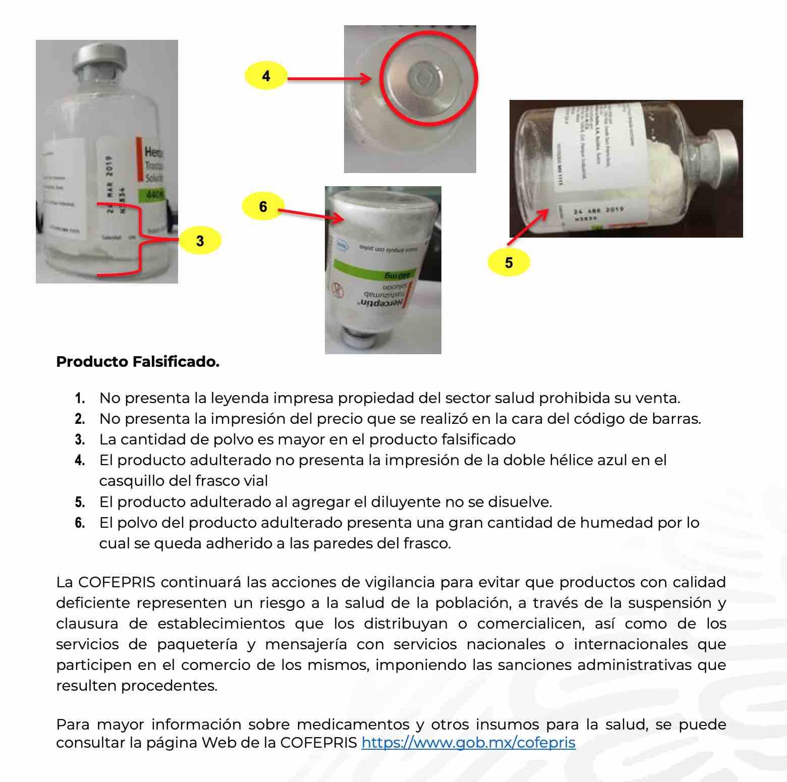 La reguladora detalló que los medicamentos falsificados no presentan la leyenda impresa "propiedad del sector salud prohibida su venta", que la cantidad de polvo es mayor en el producto falsificado, que no cuenta con la impresión de la doble hélice azul en el casquillo del frasco vial.
